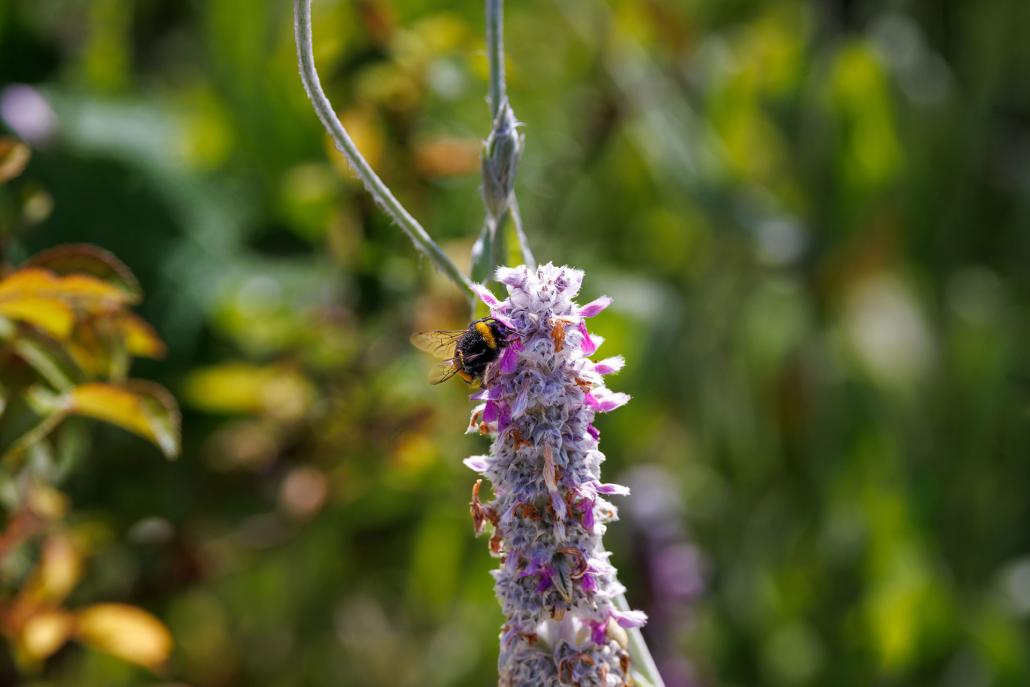 In dem Bild ist eine Hummel (Gattung Bombus) zu sehen, die eine Blüte des Woll-Ziests (Stachys byzantina) bestäubt.