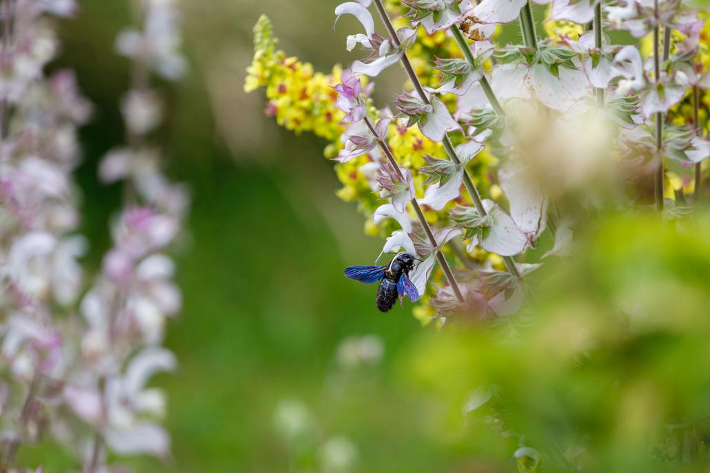 Das Insekt in der Mitte des Bildes ist die Blauschwarze Holzbiene (Xylocopa violacea), auch als Große Holzbiene bekannt.