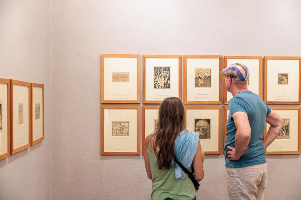 Besucher in einem Museum, die eine Sammlung von Grafiken betrachten.