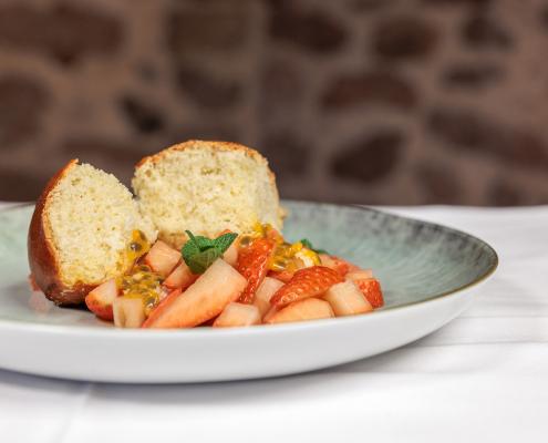 Erdbeeren mit Maracuja, Buchteln und Verjus