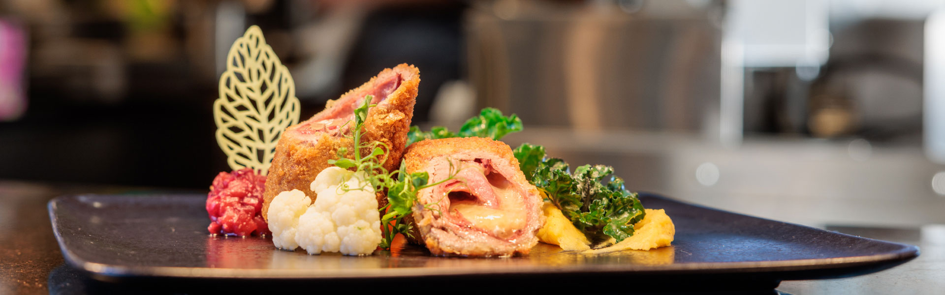 Rehscheiben in der Folie plattieren, jeweils eine Scheibe Schinken und Bergkäse darauf verteilen und zusammenklappen. Panieren wie ein normales Schnitzel, anstelle der Weißbrotkrume Panko-Paniermehl verwenden. In Butterschmalz langsam goldgelb braten.