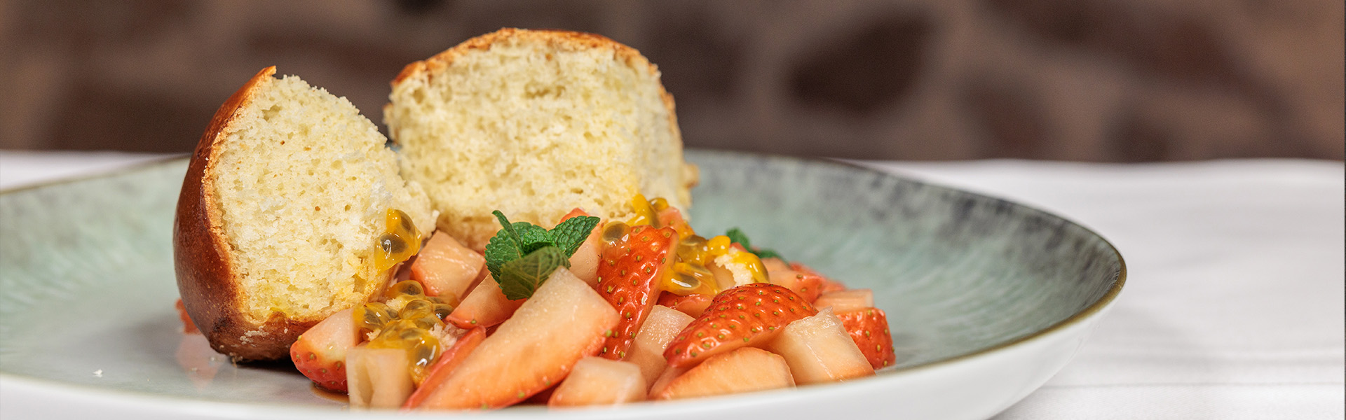 Die Erdbeeren mit etwas Verjus in einen tiefen Teller anrichten, mit Mark der frischen Maracuja dekorieren und die Buchteln dazugeben. Alles mit Puderzucker bestäuben.
